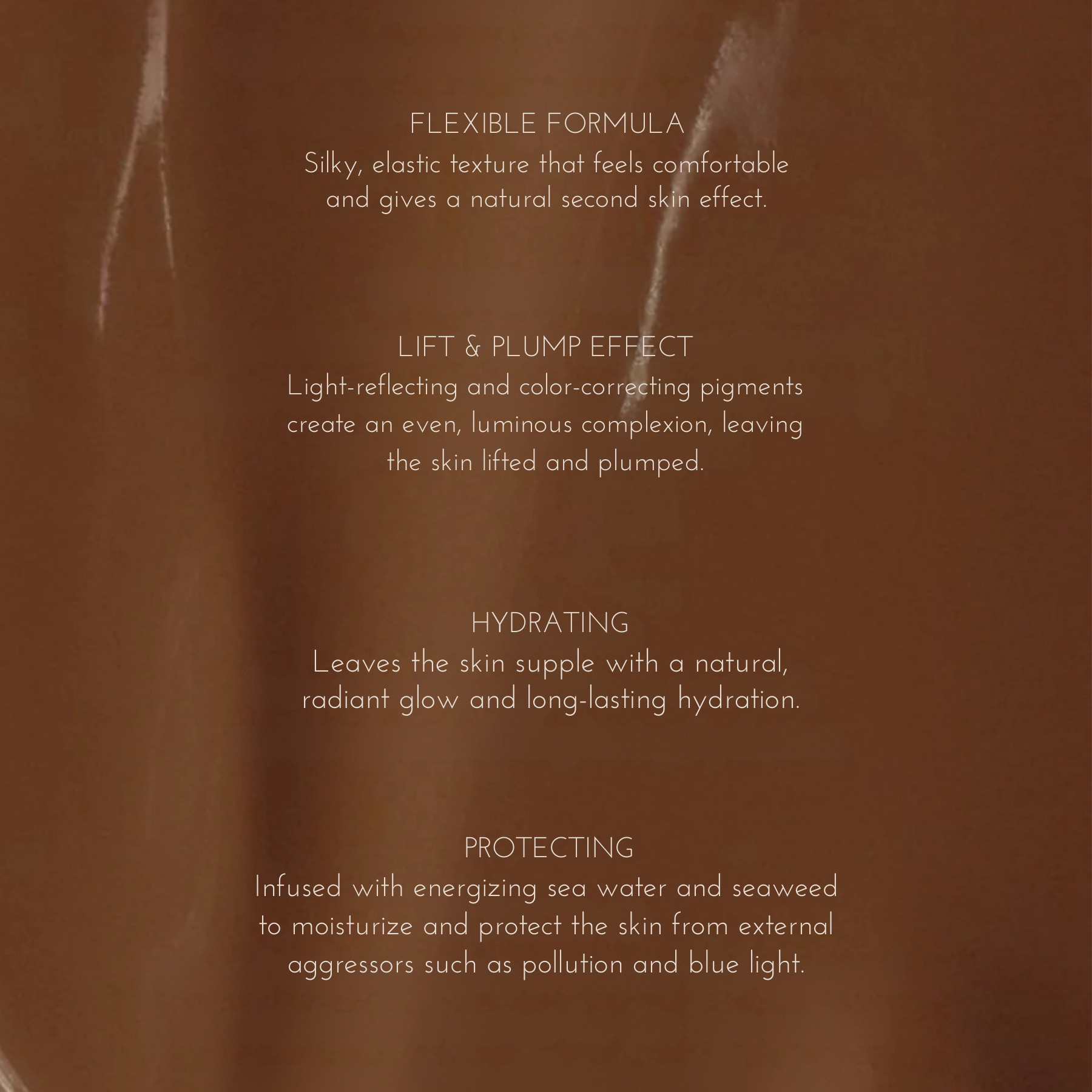 A light fluid formula for a flawless glass skin effect that lasts all day. A hybrid between skincare and foundation with a silky, elastic texture that feels comfortable and looks like a second skin. The light reflecting and flexible formula leaves the skin supple with a true source of natural radiance and guarantees non-stop hydration. Infused with energizing sea water and seaweed to moisturize and protect the skin from external aggressors such as pollution and blue light.
