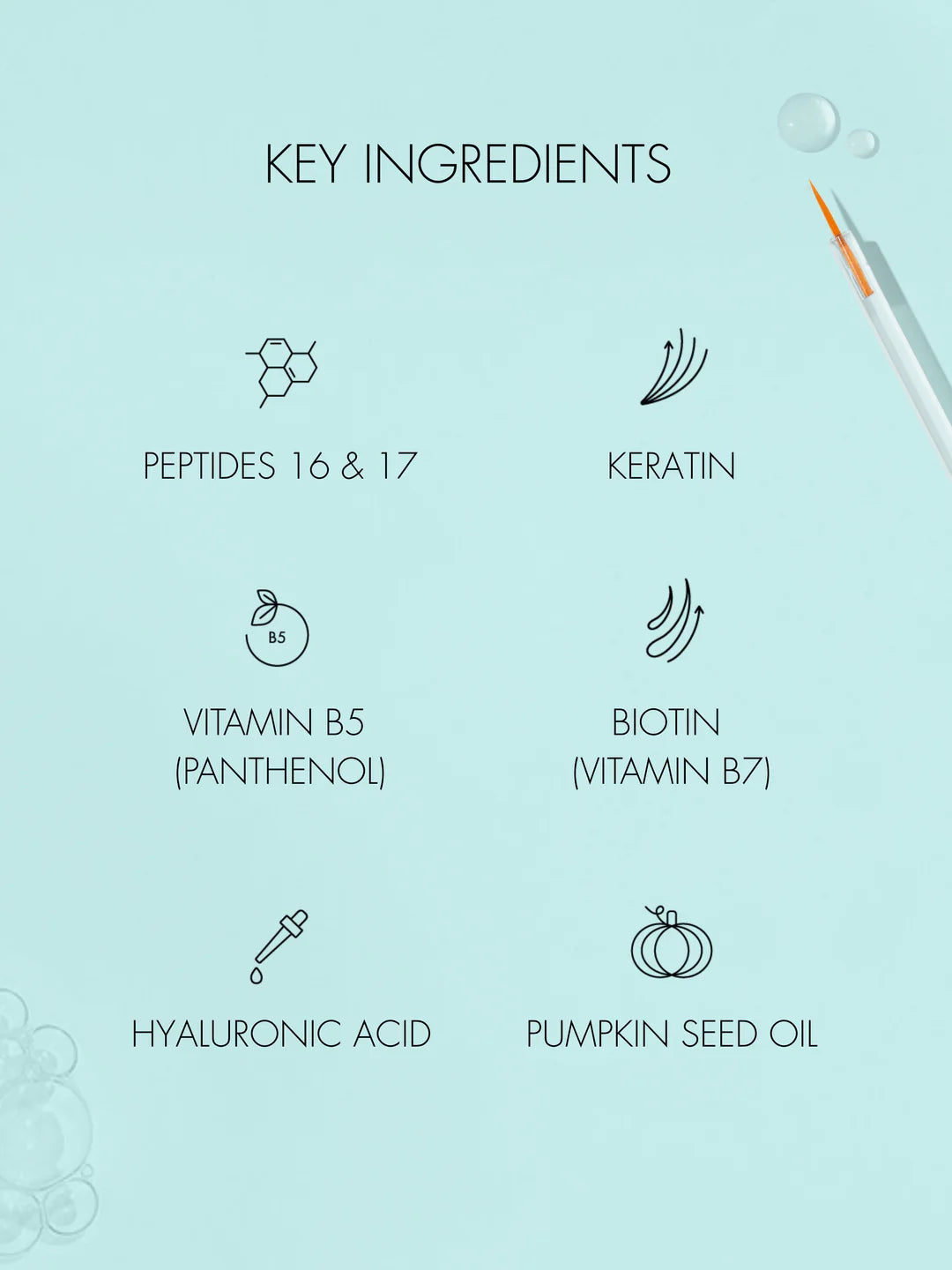 Aqua (Water), Hyaluronic Acid, Panthenol (Vitamin B5), Cucurbita Pepo (Pumpkin) Seed Oil, Myristoyl Pentapeptide-17, Biotin, Myristoyl Pentapeptide-16, Hydrolyzed Keratin, Biotinoyl Tripeptide-1, Octapeptide-2, Glycerin, Larix Europaea Wood Extract, Glycine Max (Soybean) Polypeptide.